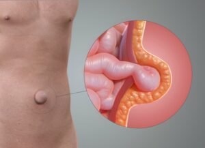 A hernia occurs when a part of an internal organ (usually intestine) protrudes through a weak area in the muscle wall. It can appear as a visible bulge and may become more noticeable while coughing, bending, or lifting heavy objects.